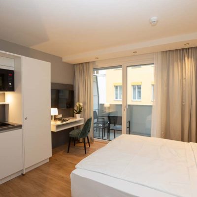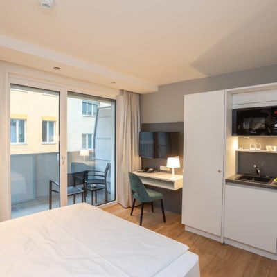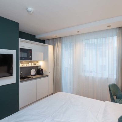 Kitchenette – Kühlschrank, Gefrierfach, Wasserkocher, Kaffeemaschine, Eierkocher, Mikrowelle mit Grillfunktion, Besteck & Geschirr