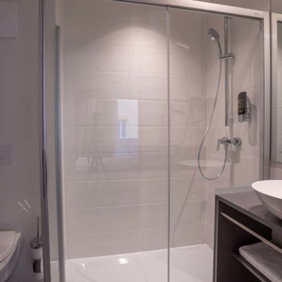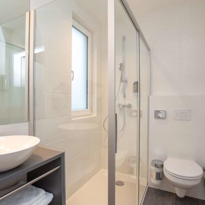 Bad – Dusche Mit Kosmetiktüchern, Shampoos etc., Handtücher und Föhn